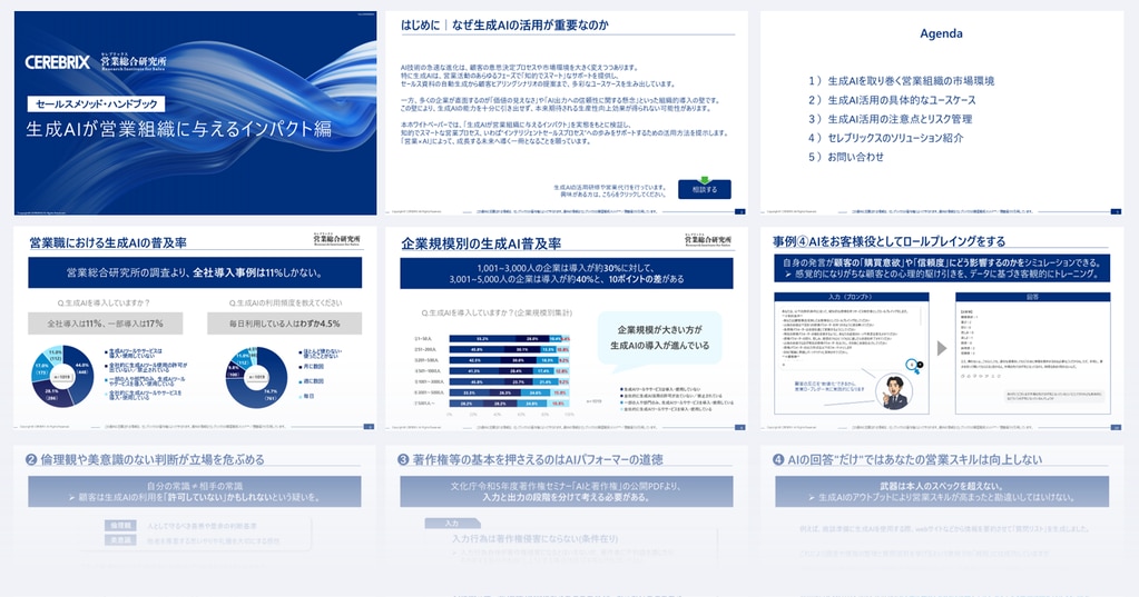 セレブリックスでは、営業現場での実践知をベースに、生成AIの基礎からプロンプト作成、業務への落とし込み、ガイドライン整備までを体系的に学べる社内研修をご提供しています。「まずは全員が使える状態を作りたい」「チームで成果が出る使い方に揃えたい」という方は、ぜひお気軽にご相談ください。