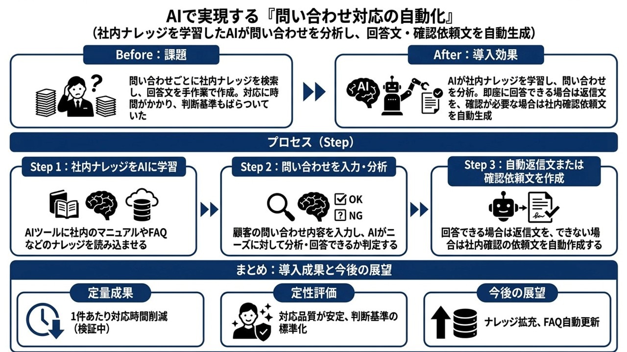この運用により、担当者ごとの調査時間を削減しつつ、問い合わせの意図に沿った返信文を安定して作りやすくなります。また、社内確認が必要なケースでも、確認依頼の文章が揃うことで、必要な情報が集まりやすくなり、対応の停滞を防ぎやすくなります。