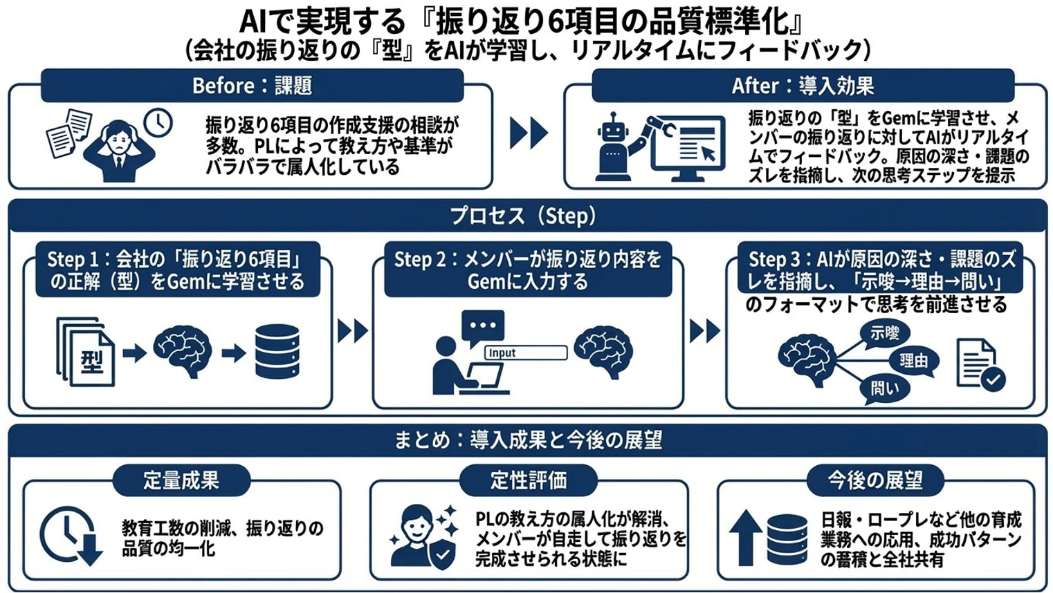 結果、振り返りの品質が書き手のセンスに依存しにくくなり、教育の質も均一化しやすくなりました。また、この仕組みは日報だけでなく、ロープレの振り返りなど定例の育成業務にも応用できるため、現場インパクトが大きいのもポイントです。