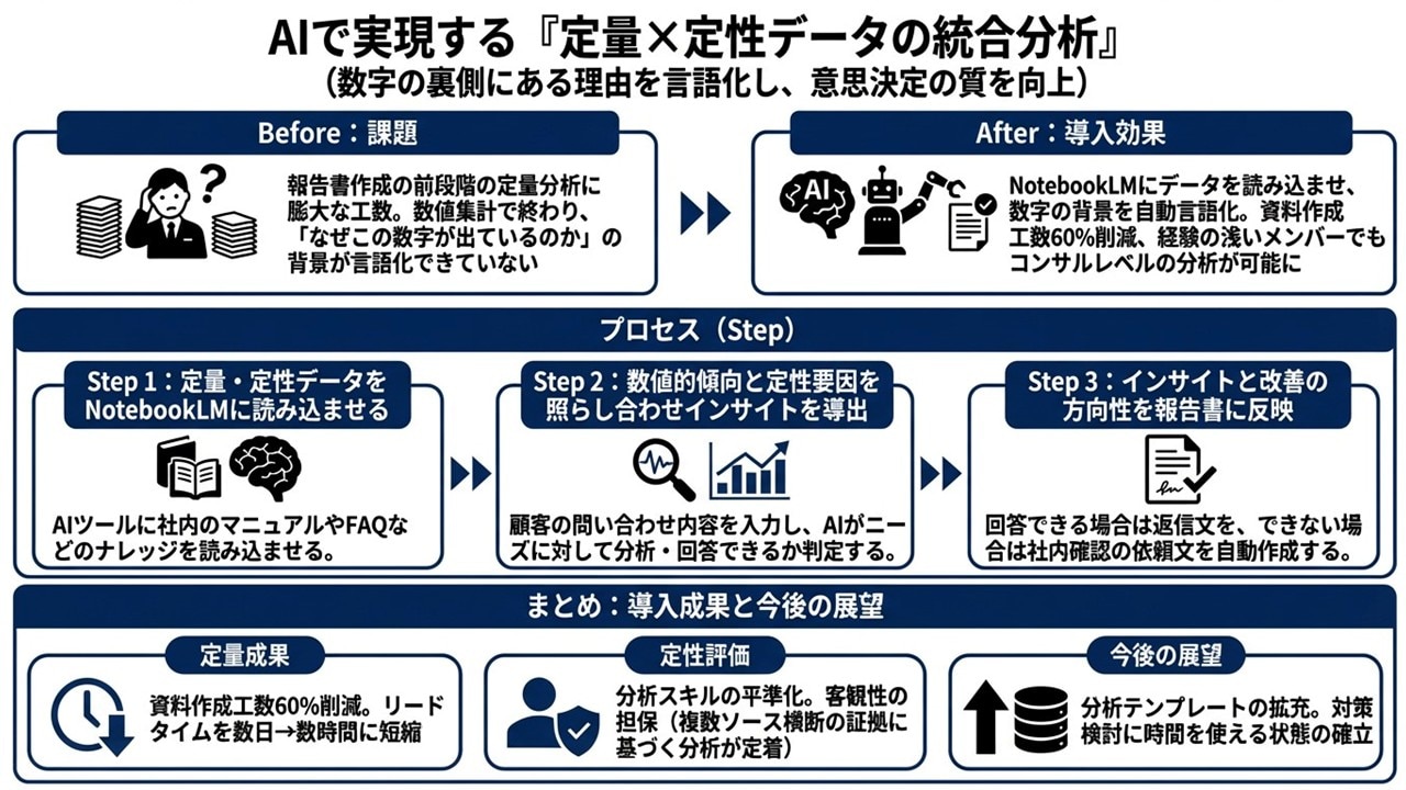 事例⑥ 定量×定性データの統合分析|分析工数を削減し、報告資料の叩き台を高速化