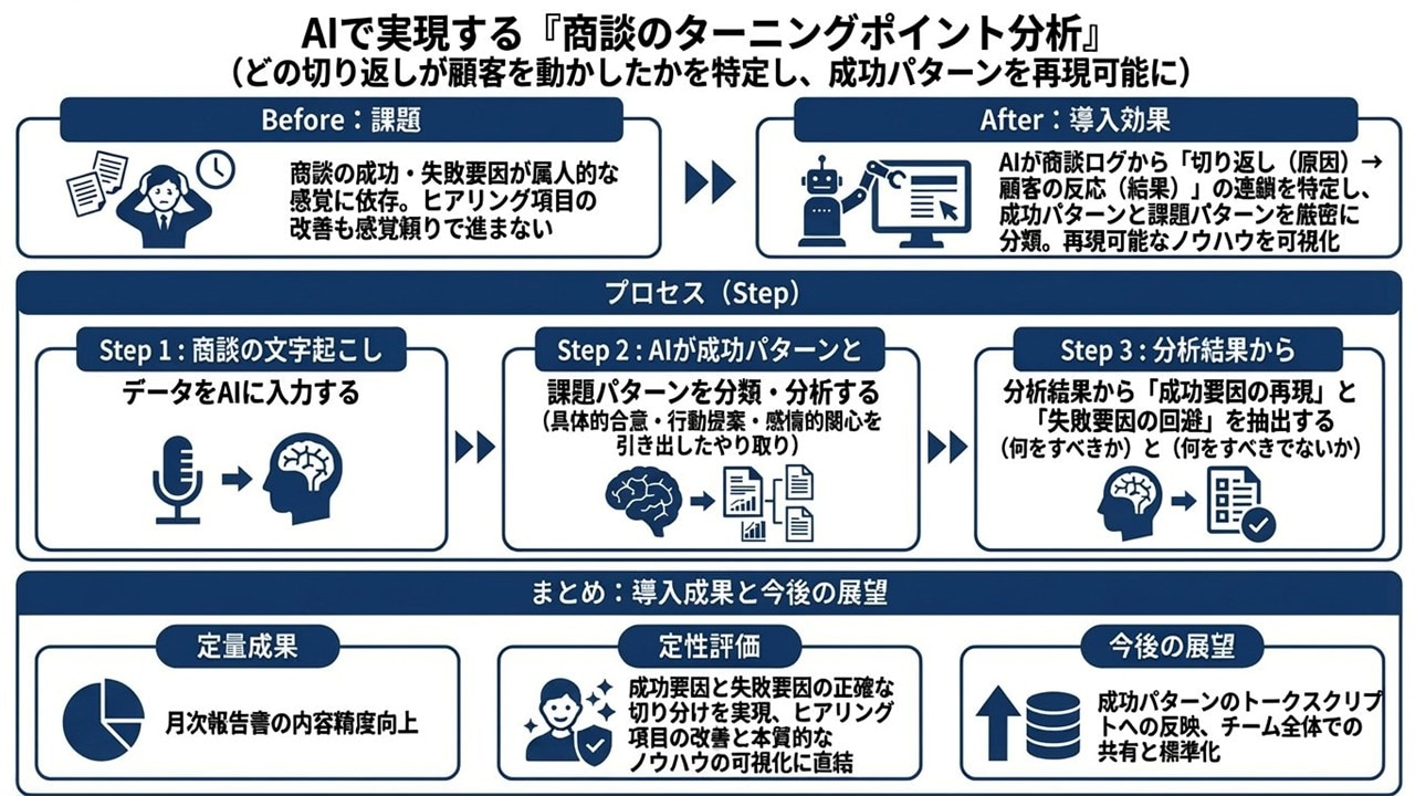 商談の改善スピードは、「文字起こしログ → 成功/失敗の分かれ目(ターニングポイント)を特定 → 次に再現すべき打ち手を言語化」を標準プロセスにすることで、一気に上げられます。