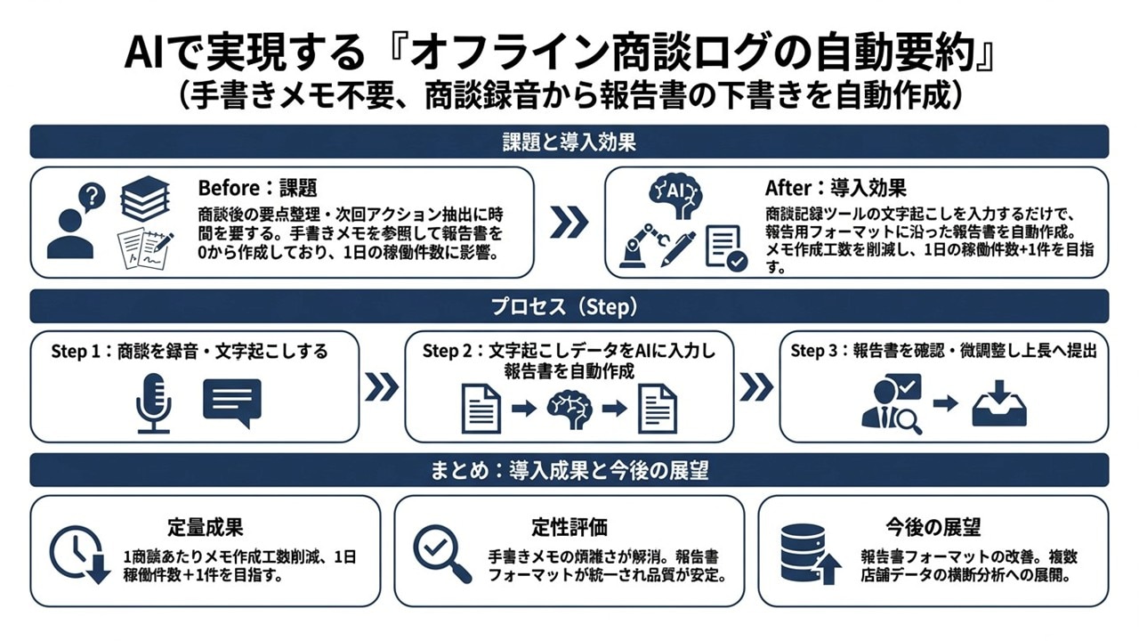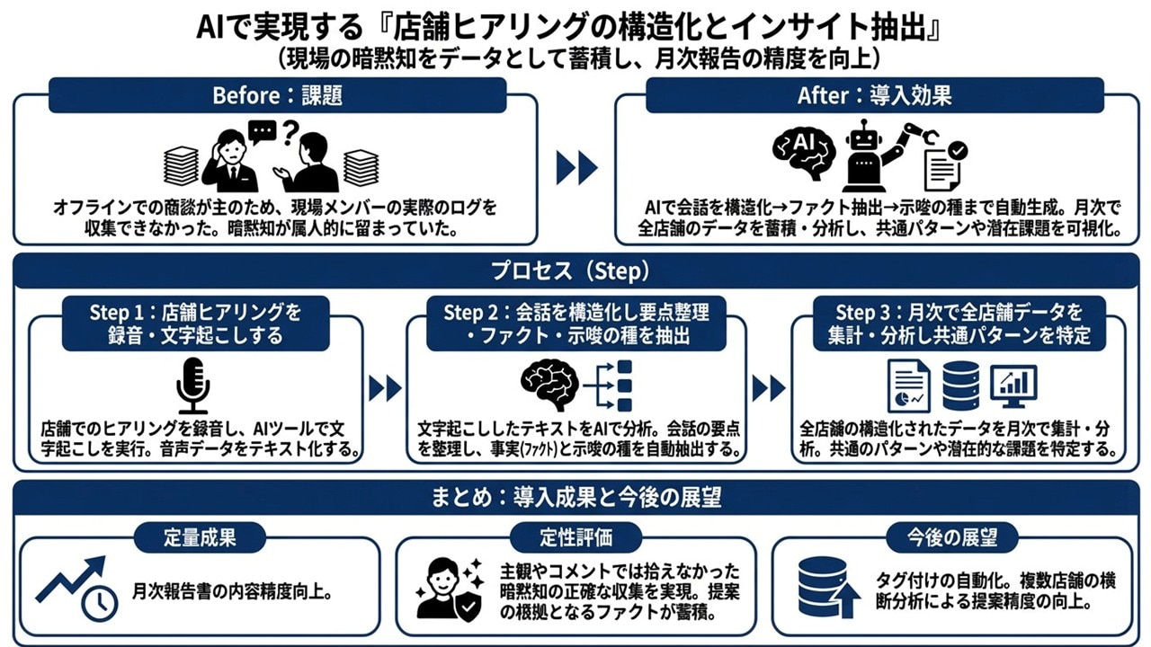 オフライン商談(店舗巡回・ラウンダー業務など)の成果を伸ばすには、「現場の会話・ヒアリング内容を比較できるデータとして蓄積し、提案に戻す」ことが欠かせません。