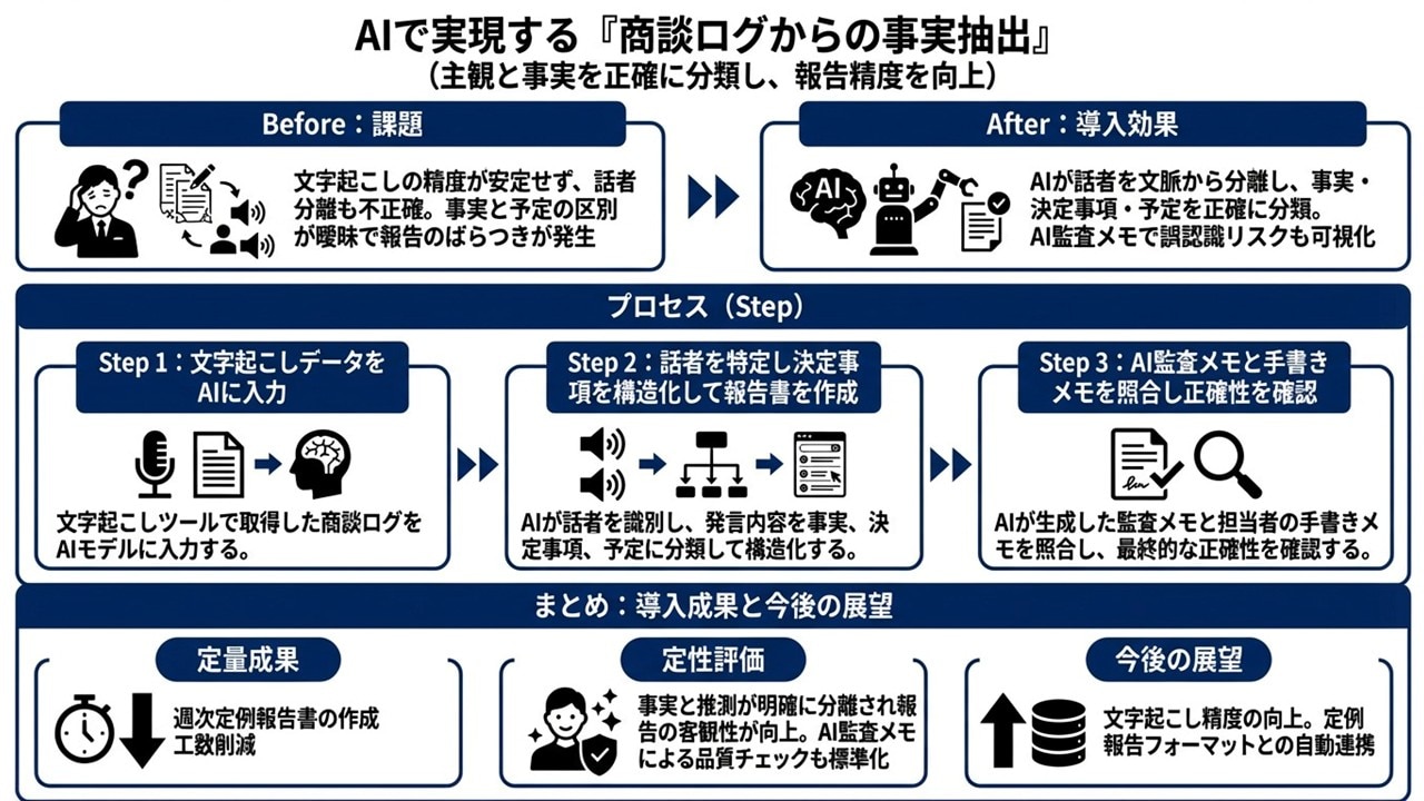 商談報告書の精度は、「文字起こしログ → 事実と予定を分類 → 話者分離 → AI監査」を標準プロセスにすることで、安定させられます。