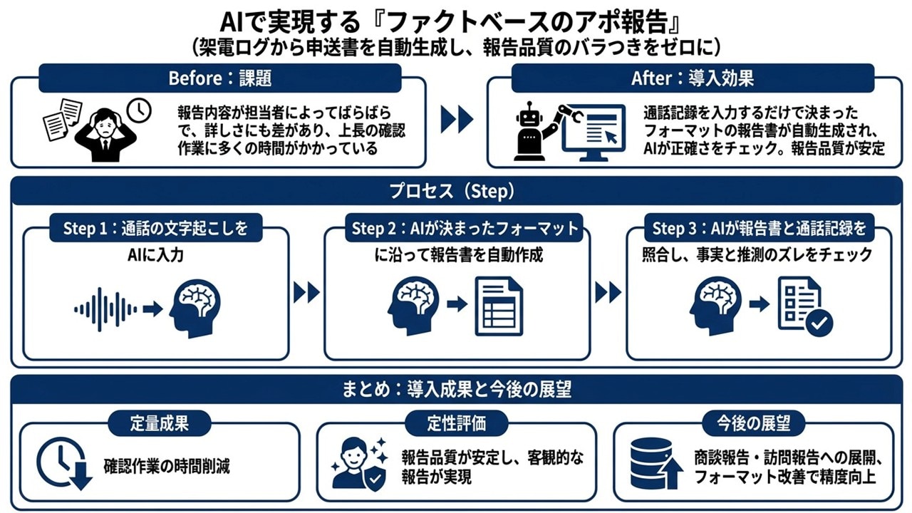 アポ報告(申送書)の作成時間と上長の確認工数は、「架電ログ → 定型フォーマット生成 → ファクトチェック」を標準プロセスにすることで、同時に削減できます。