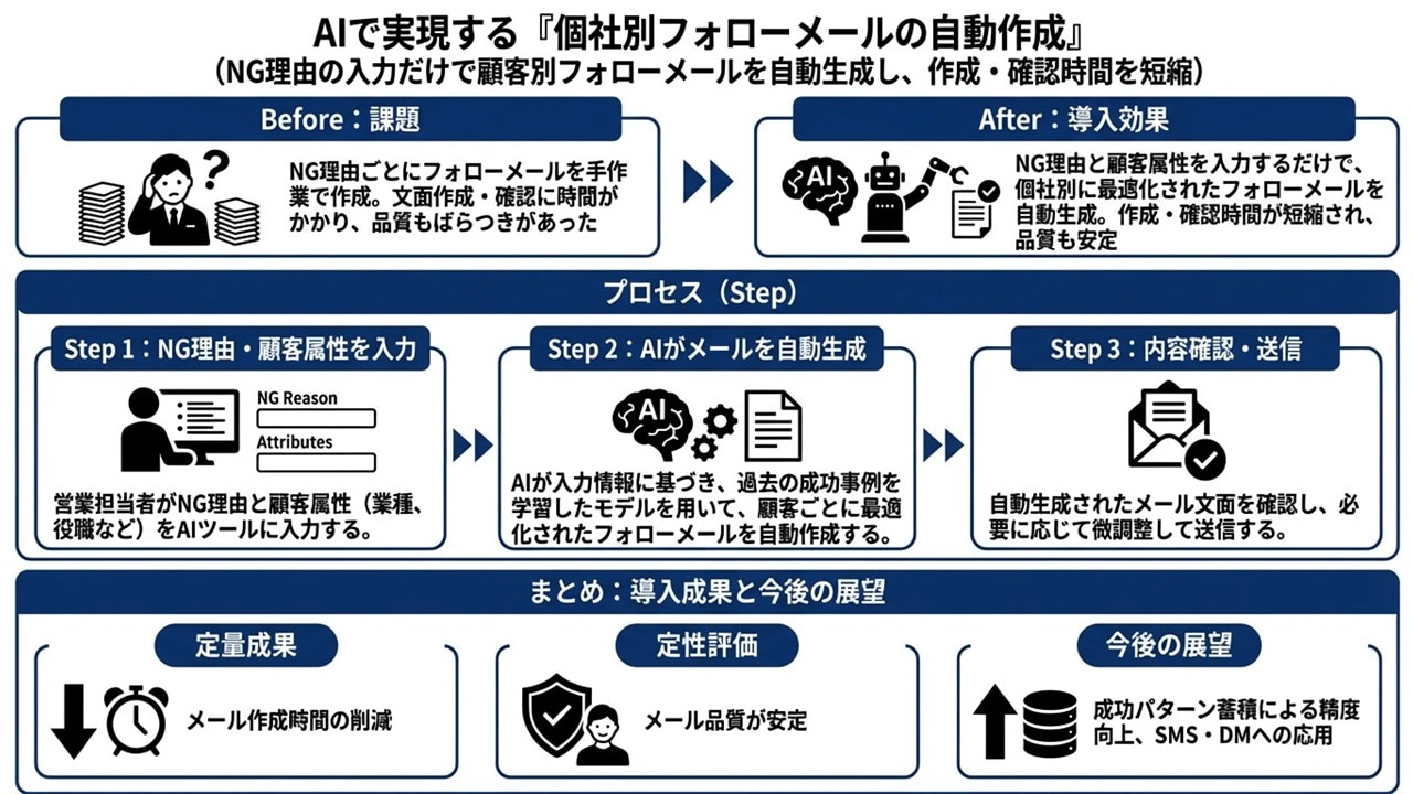 1to1フォローメールの作成時間と修正回数は、「見送り理由・失注理由」を起点に文章を組み立てるだけで大きく減らせます。