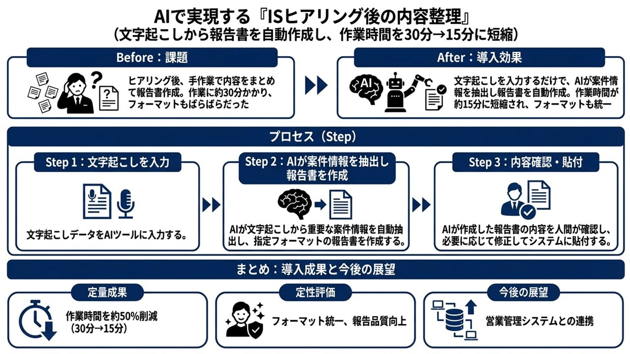 事例③ISヒアリング後の内容整理|引き継ぎ情報を自動抽出し、作業時間を約50%削減