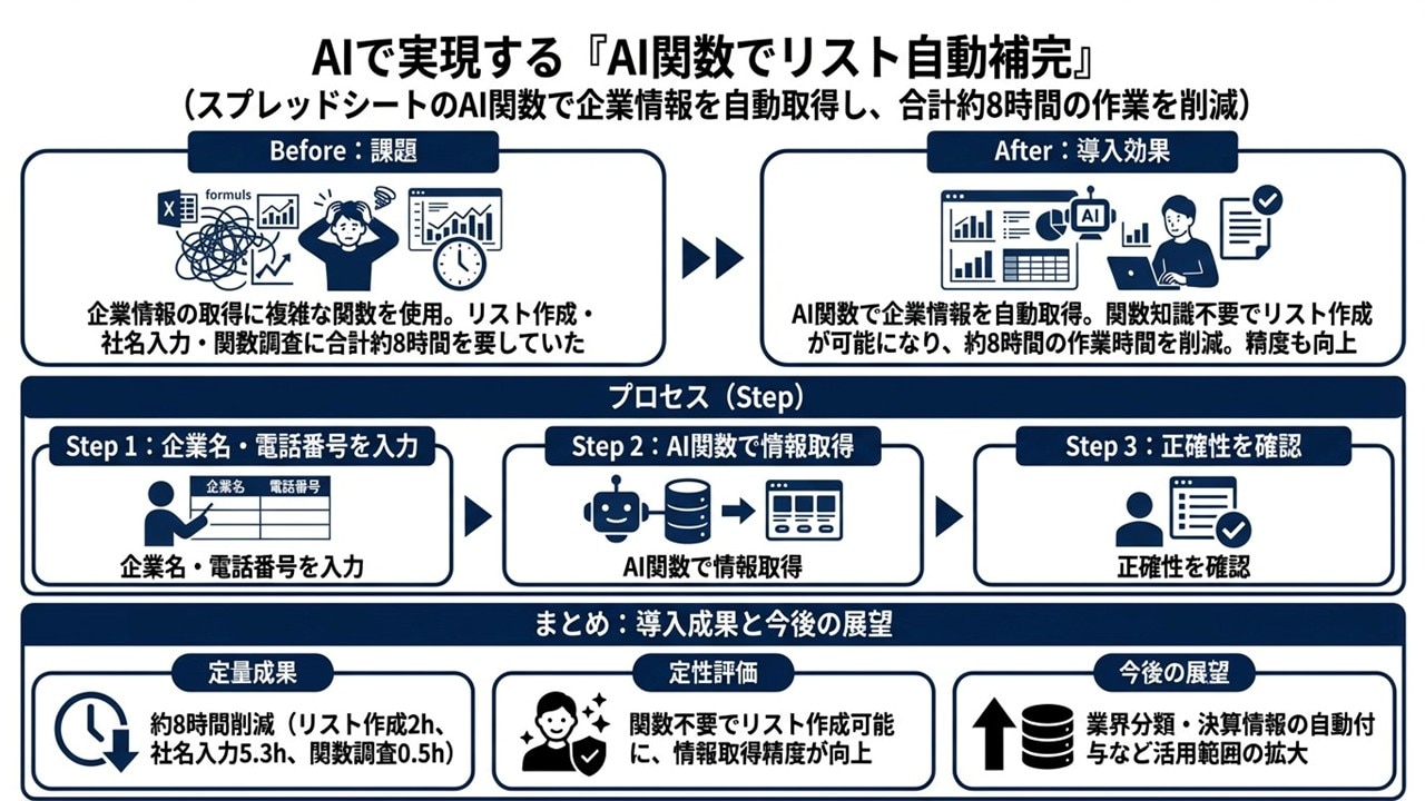 企業名や電話番号などのセルをAI関数に渡して一括で整え、整形結果だけを目視でチェックすることで、手作業の大半を削減します。