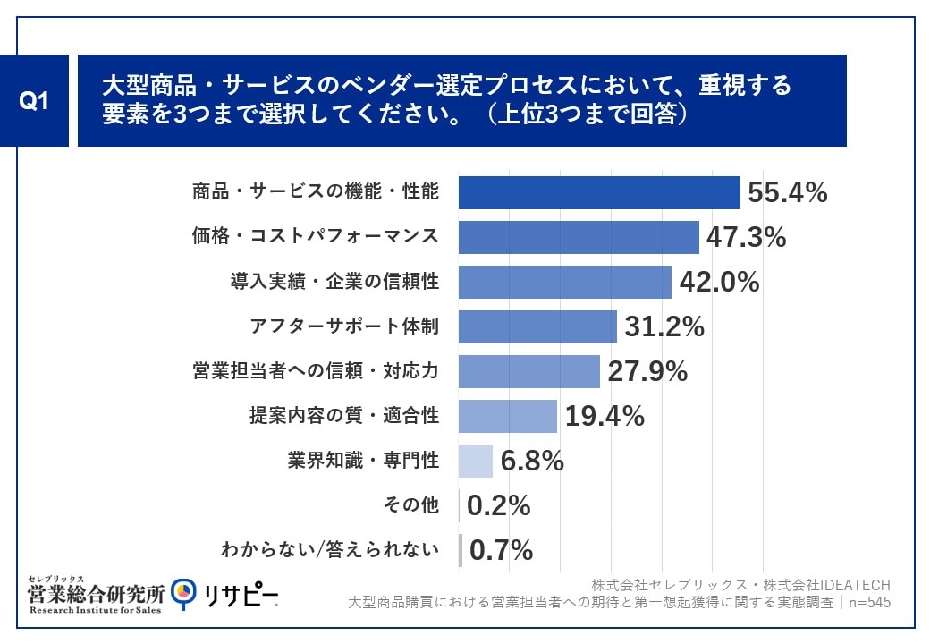 大型商談のベンダー選定プロセスにおいて、回答者が重視する要素が上図1です。