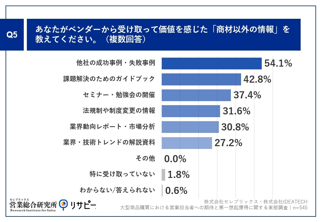 図5の「あなたがベンダーから受け取って価値を感じた「商材以外の情報」を教えてください。」という質問では、特に求められている情報は、「成功事例と失敗事例」(54.1%)という結果でした。