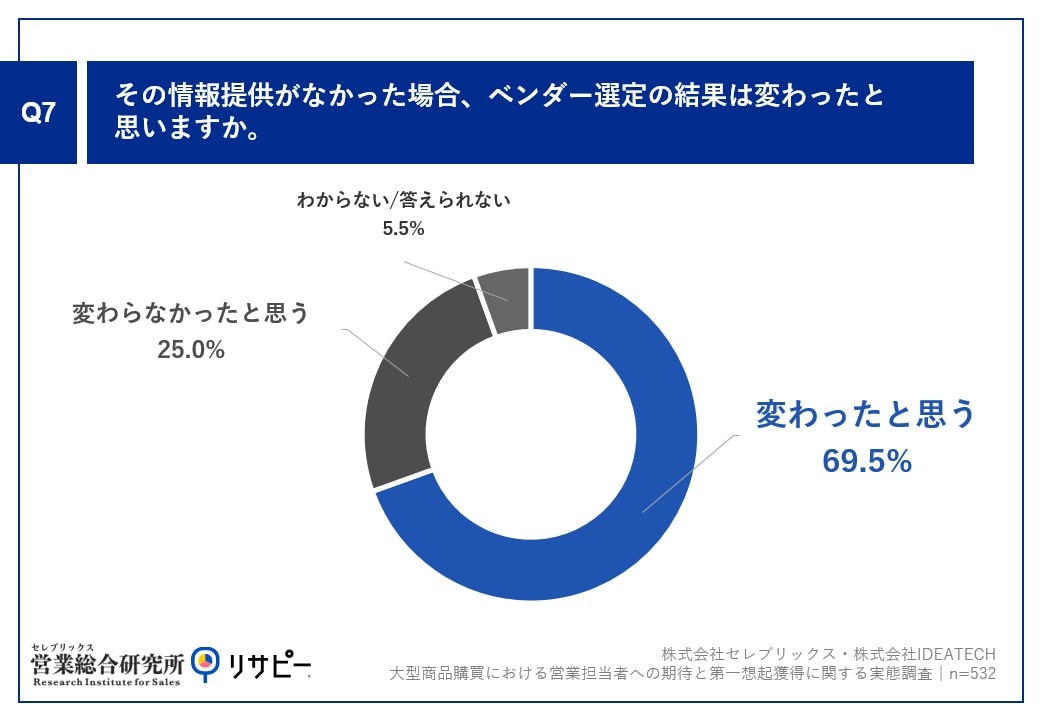 「その情報提供がなかった場合、ベンダー選定の結果は変わったと思いますか。」という質問では、約7割(69.5%)が「変わったと思う」と回答しています。
