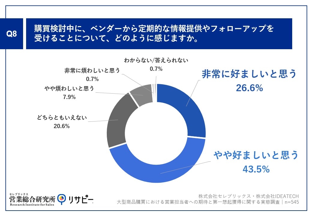 次に「購買検討中に、ベンダーから定期的な情報提供やフォローアップを受けることについて、どのように感じますか。」という質問では、過半数の回答者が「好ましい」と感じているという結果が出ました。