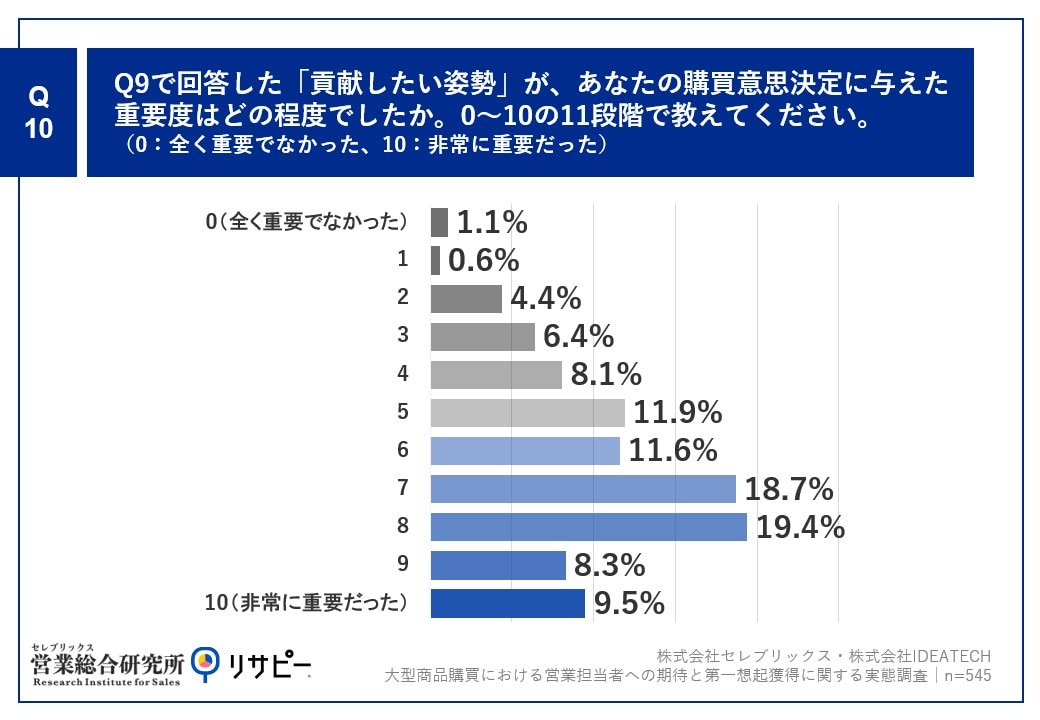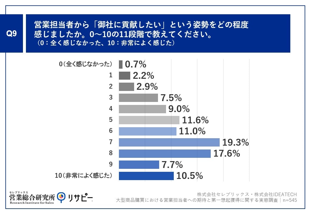 さらに、図9の「営業担当者から「御社に貢献したい」という姿勢をどの程度感じましたか」という質問では半数以上(55.1%)が7点以上と回答しました。