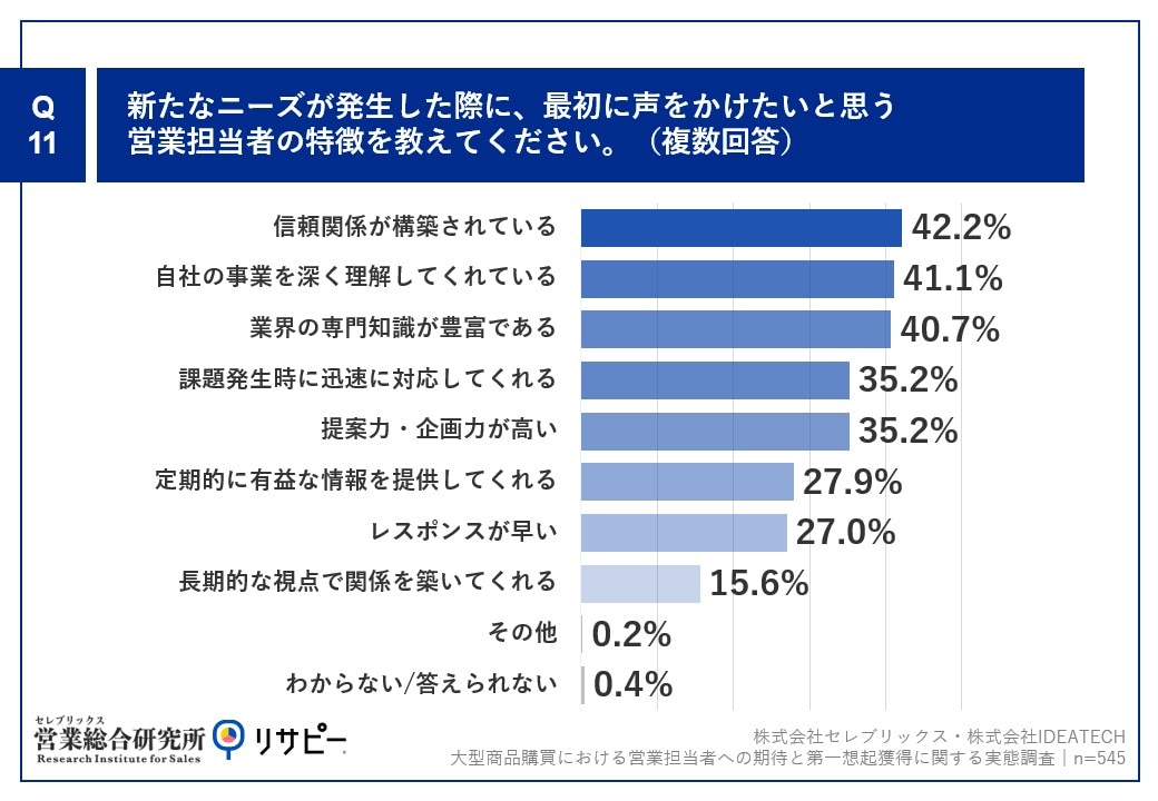 最後に「新たなニーズが発生した際に、最初に声をかけたいと思う営業担当者の特徴を教えてください。」という質問では、