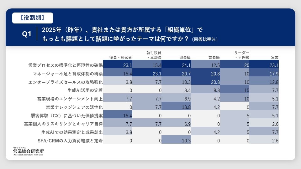 2025年、営業組織でもっとも話題となったテーマを設問毎に可視化します。