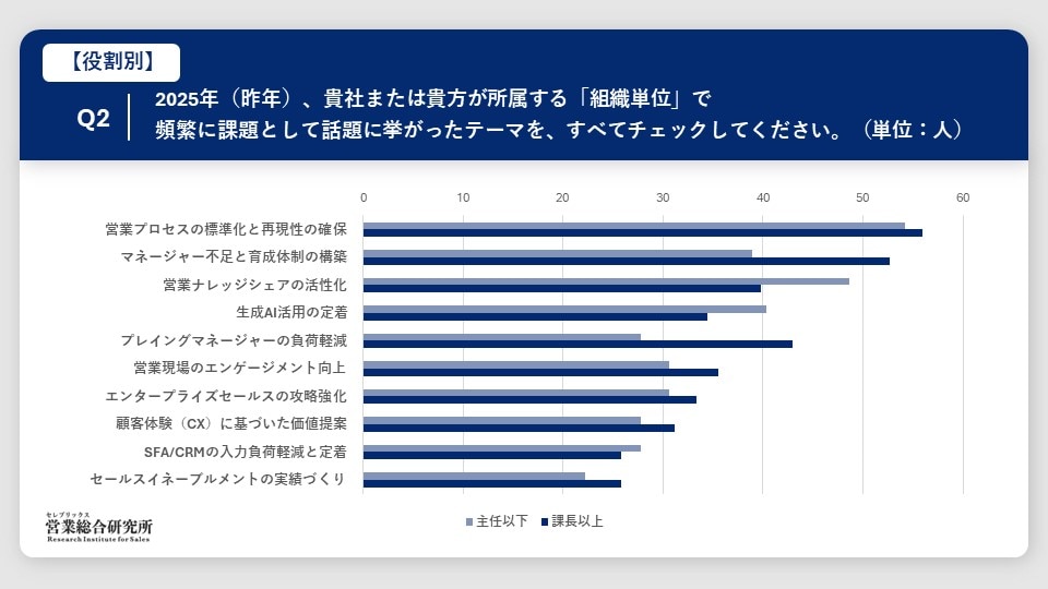 分母が広がるQ2において順位を下げた事実は、このテーマが営業組織全体に共通する悩みではなく、特定のフェーズや戦略を持つ組織に特化した「尖った課題」であることを示しています。