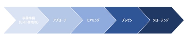 アプローチ | 事前準備した内容を実行に移します。初めての飛び込みの場合は、アプローチ先で臆してしまうケースが多いですが、断られることを前提に考え訪問することが重要です。 |