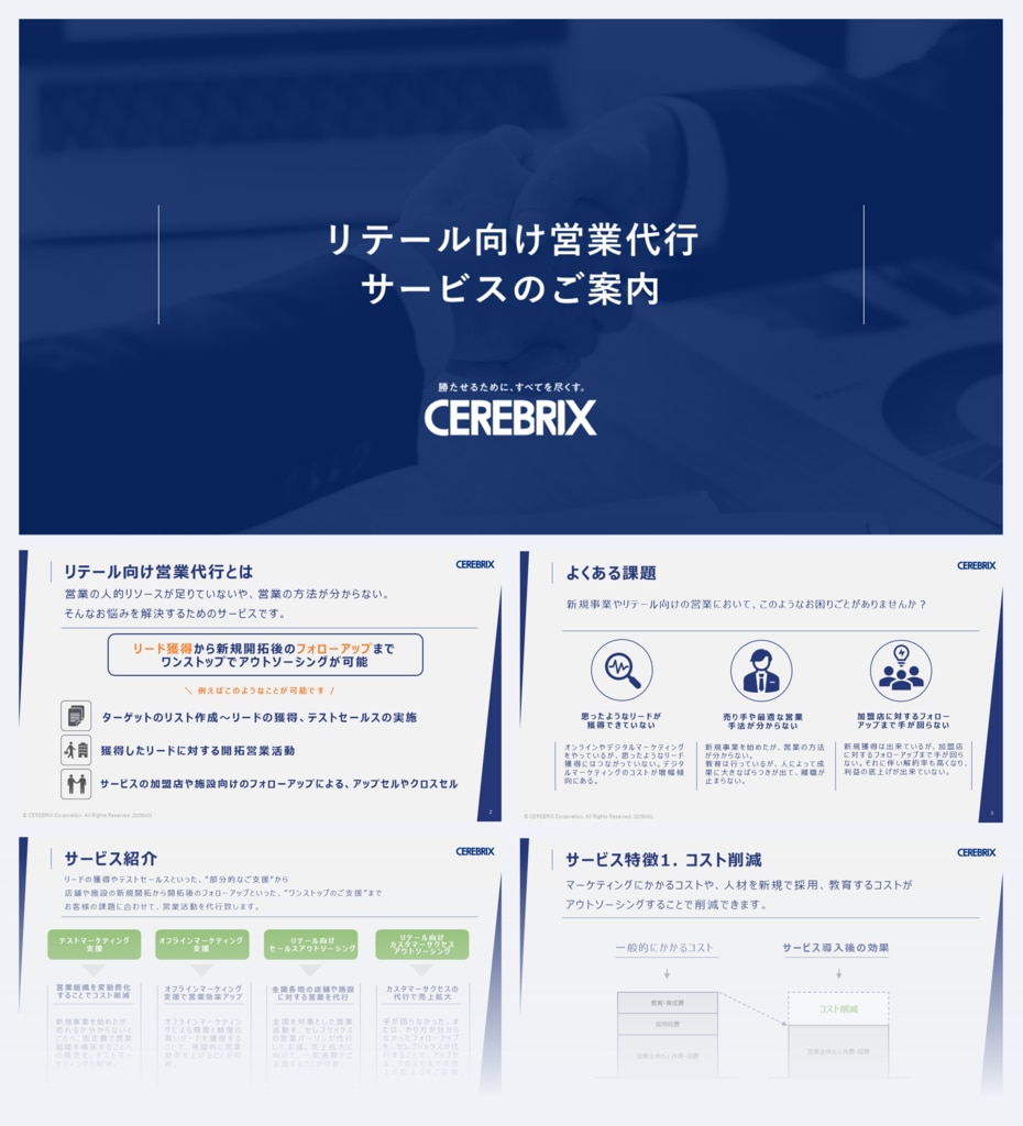 リテール向け営業代行サービスでは、リード獲得から新規開拓後のフォローアップまでワンストップでアウトソーシングが可能です。本資料では、具体的な支援内容やプランをご紹介しています。