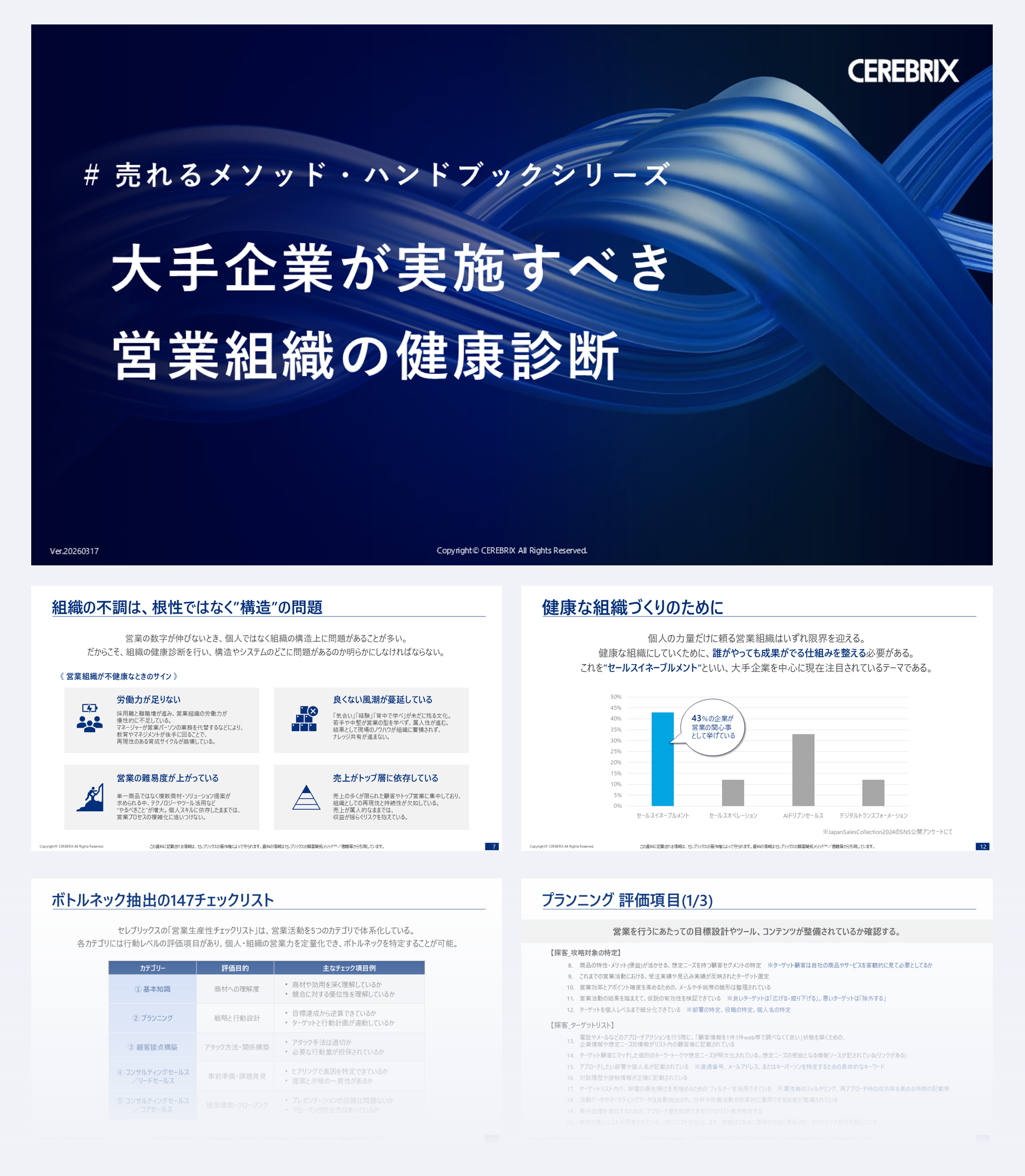売上の達成がトップセールス頼りになっていませんか?属人化した組織は、離職や環境の変化で一気に崩れるリスクがあります。本書では、セレブリックスが現場支援で培った「組織の健康状態を測る診断フレーム」を大公開します!