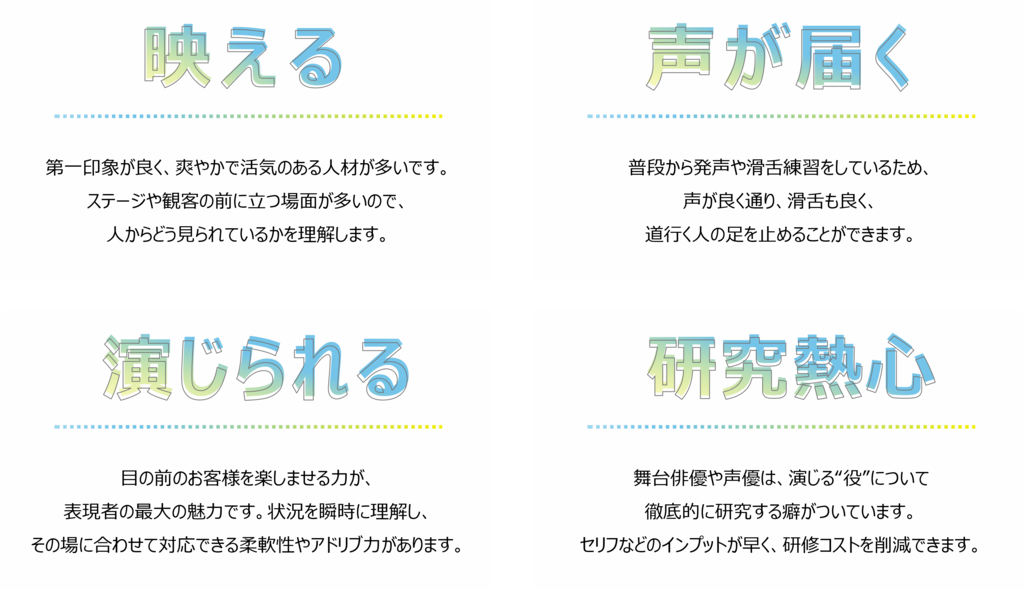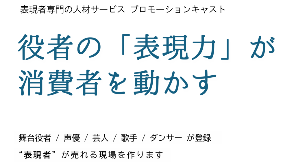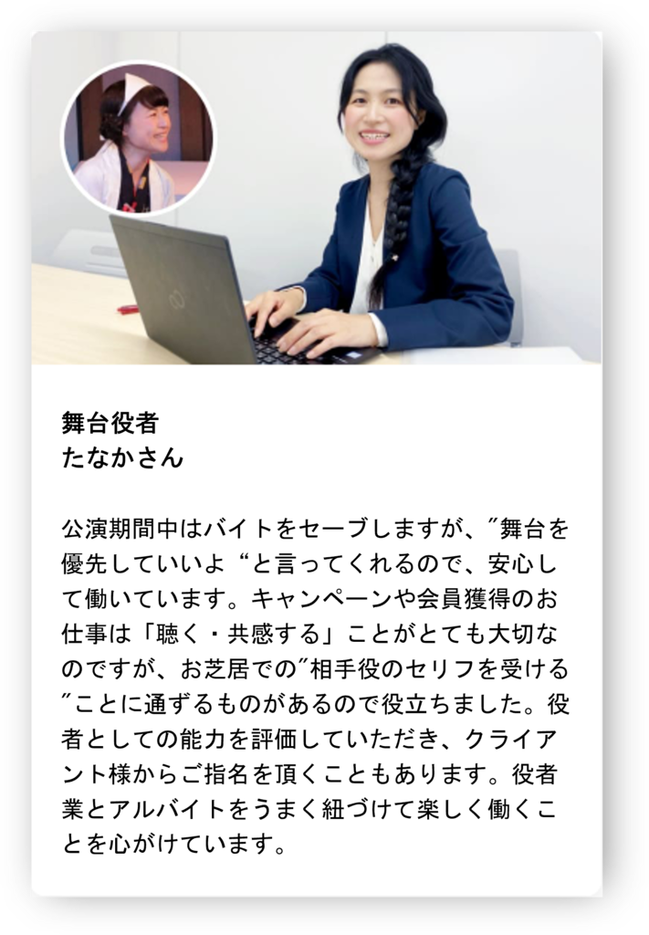 元劇団員である当社の採用担当が立ち上げた、夢を追う表現者を集めた人材サービス。