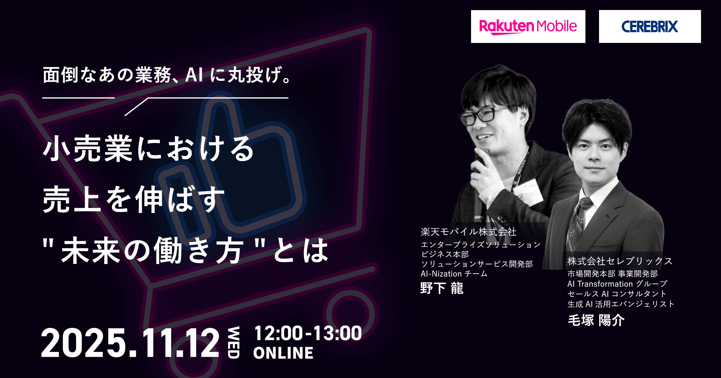 そこで本セミナーは、Rakuten AI for Businessを提供している楽天モバイル社と具体的なAI活用の成功事例をAIの市況感を交えてお届けいたします。